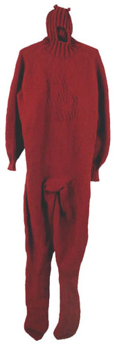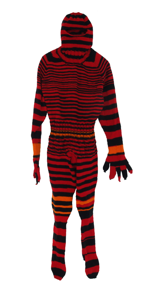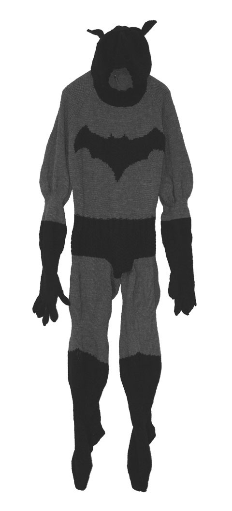 The Sweatermen are heroes of my own invention. They push the language of the hero costume by highlighting knitting materials, textures, and traditions in the form of the costume. Some of the color and texture choices, as in Sweaterman 3, are based on the sweaters my mother made, her love of cables, and her color choices. The most recent costumes in this series (Sweaterman 4-9) combine the colors of comic book heroes with detailed knitting patterns. In each of these I work to forge a link between childhood experience and my adult exploration of protection, masculinity, and heroism.
